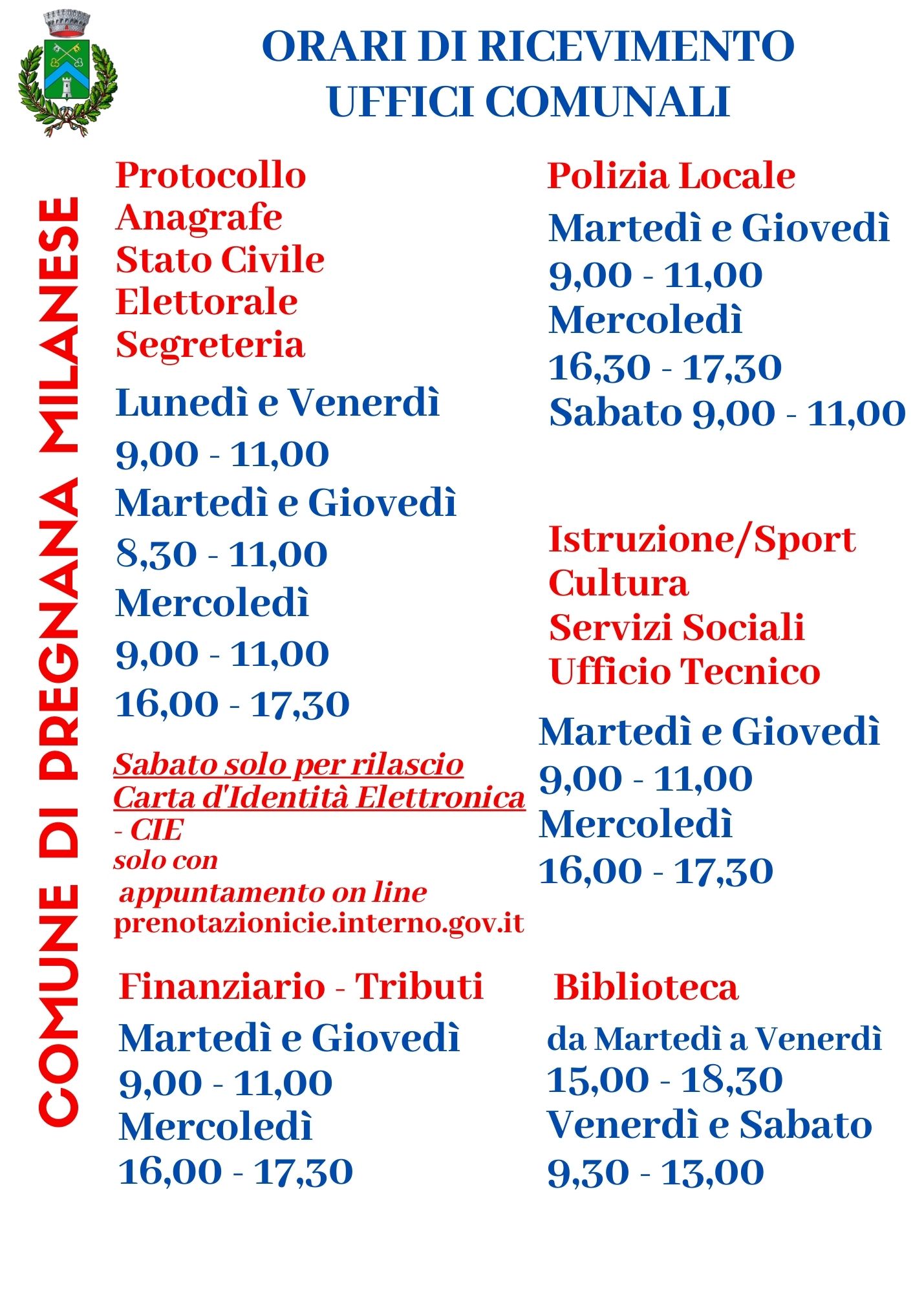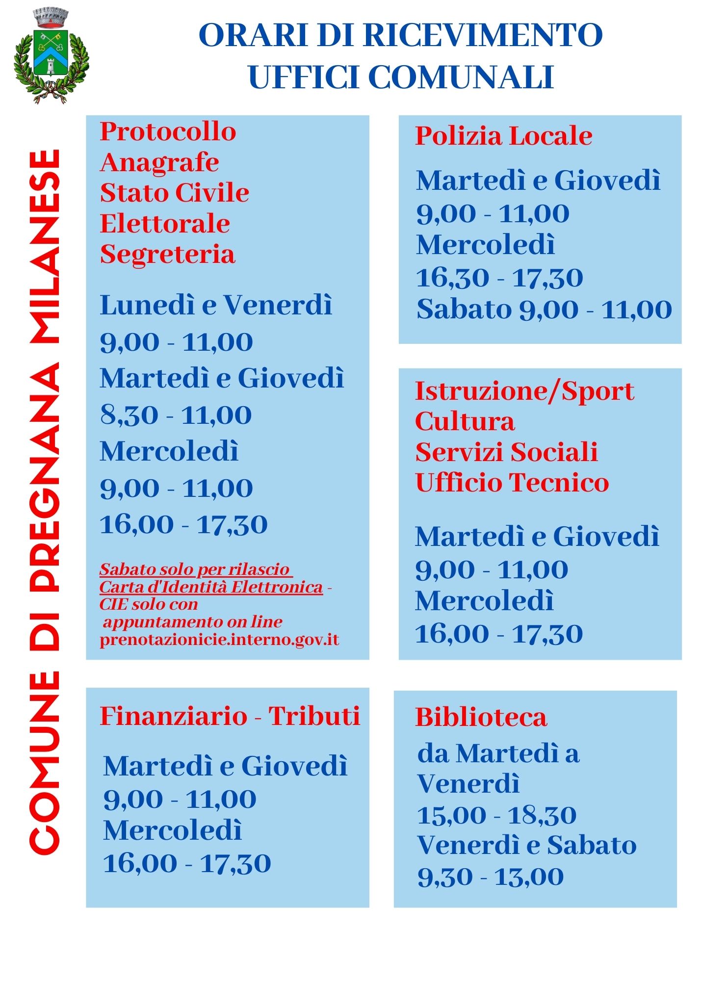 Dal 2 febbraio 2026 il Comune di Pregnana Milanese modificherà l’orario di lavoro degli uffici.